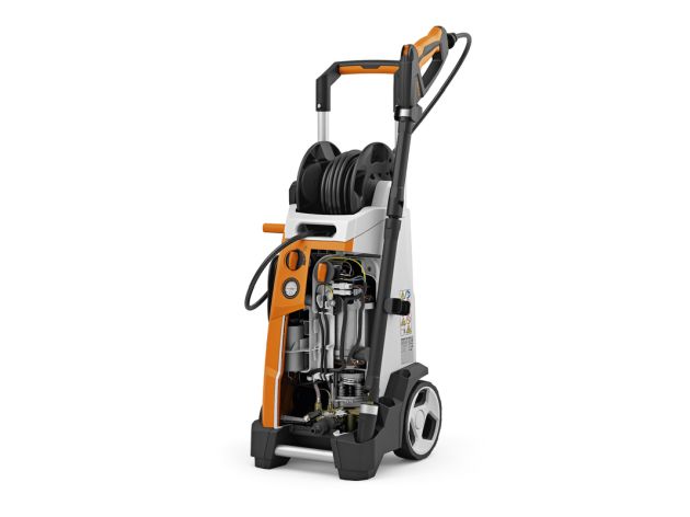 Det fällbara handtaget och den integrerade vagnen gör det enkelt och bekvämt att transportera STIHL RE 140 PLUS till varje rengöringsuppgift. Dessutom, med den praktiska slangvindan och 12 m stålkordsarmerad högtrycksslang behöver du aldrig oroa dig för att slangen ska trassla sig och krångla under arbetet.
